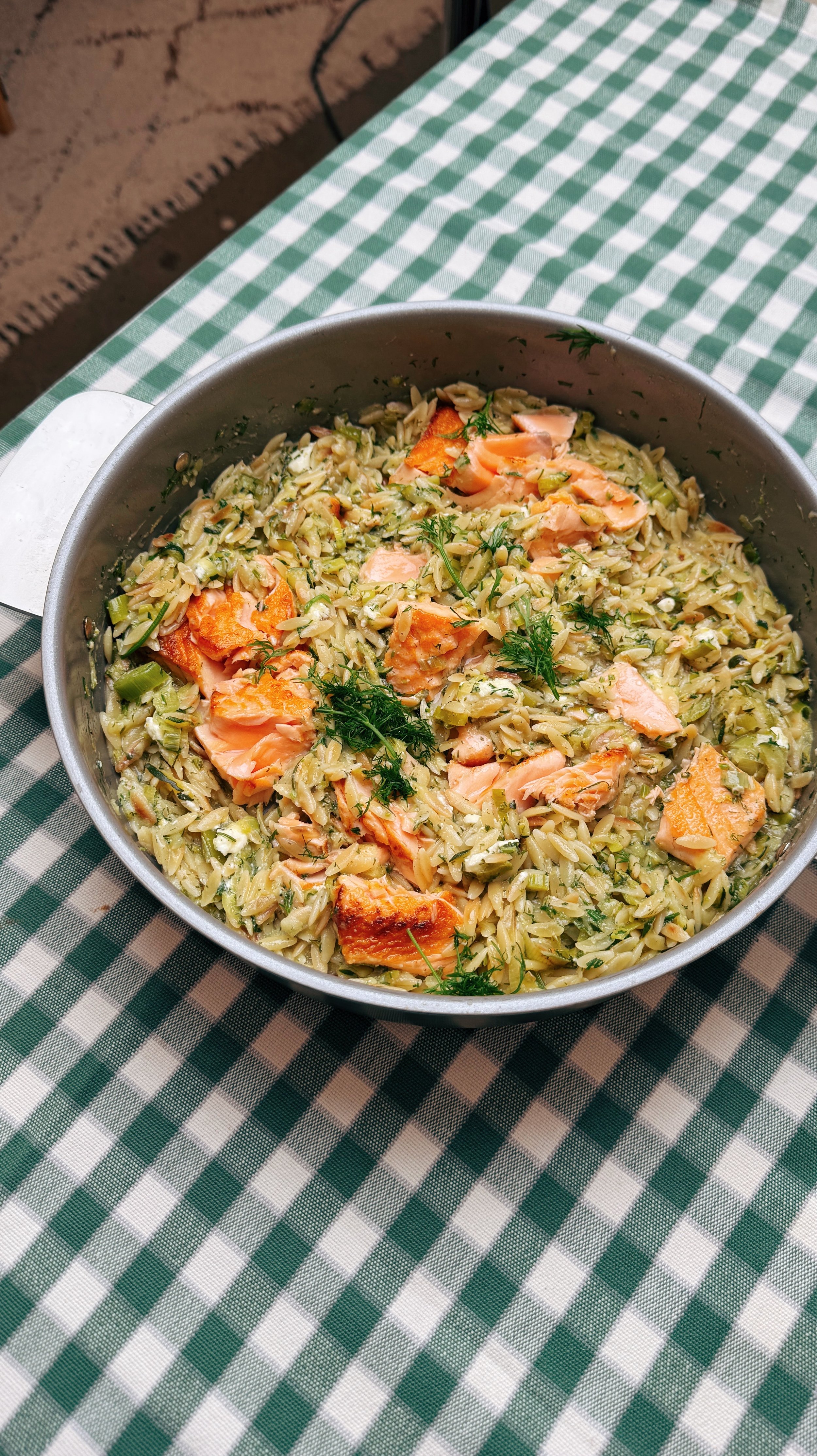 Tämä pannullinen lohta ja orzoa hurmaa kaikki syöjät. Superherkullinen ja helppo one-pot ruoka valmistuu alle 30 minsassa.