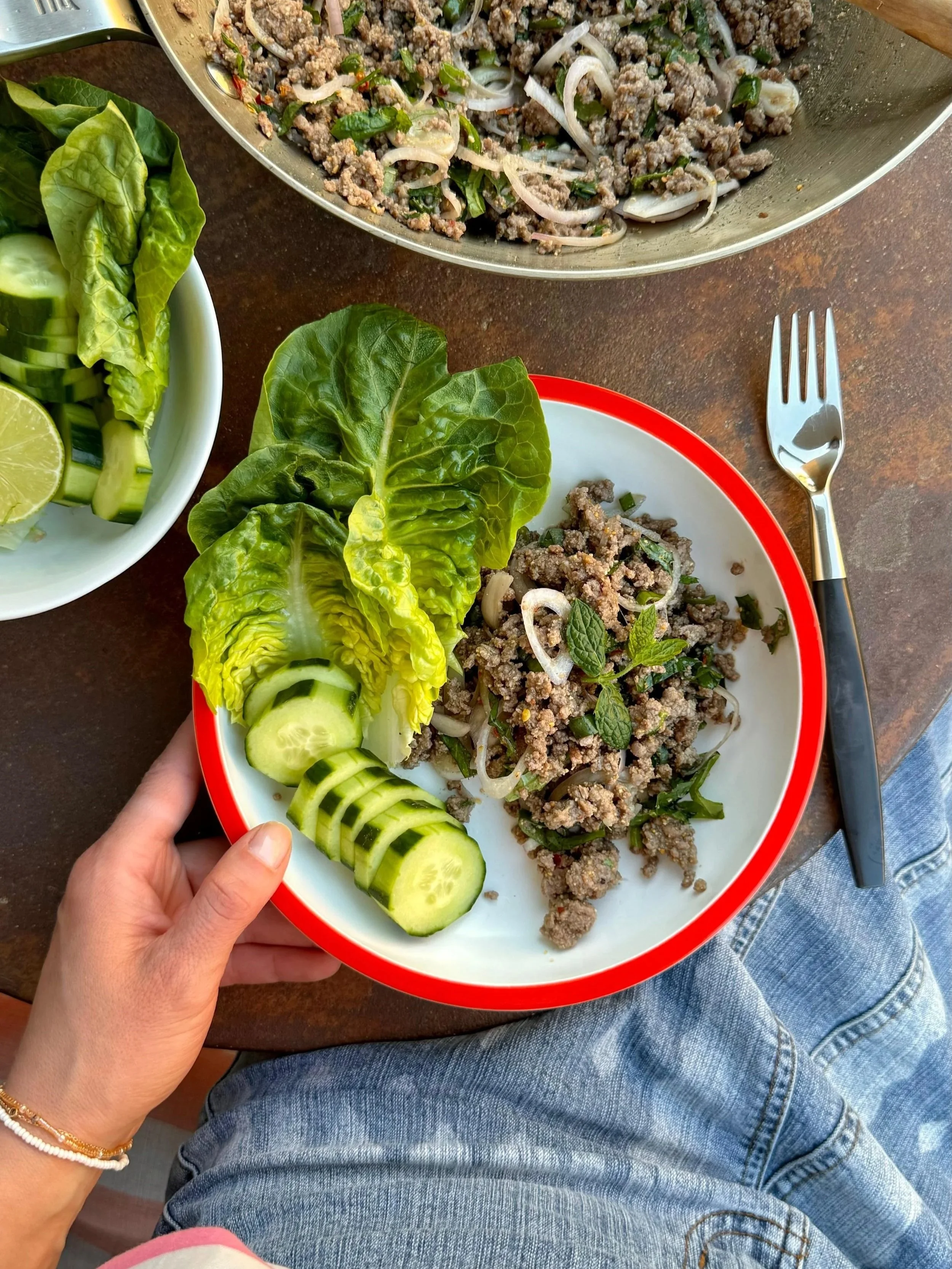 Kun tekee mieli jotain freesiä ja tulista = larb. Petran bravuuriksi muodostunut larb on kaakkoisaasialainen jauhelihasalaatti. Se on täydellinen yhdistelmä paahdetun riisijauhon rouheutta, limen kirpakkuutta, mintun raikkautta ja just sopivaa potkua. Lusikoi salaatinlehdille ja syö käsin, ihan täydellistä silloin kun haluut kokeilla jotain uutta ja helppoa!