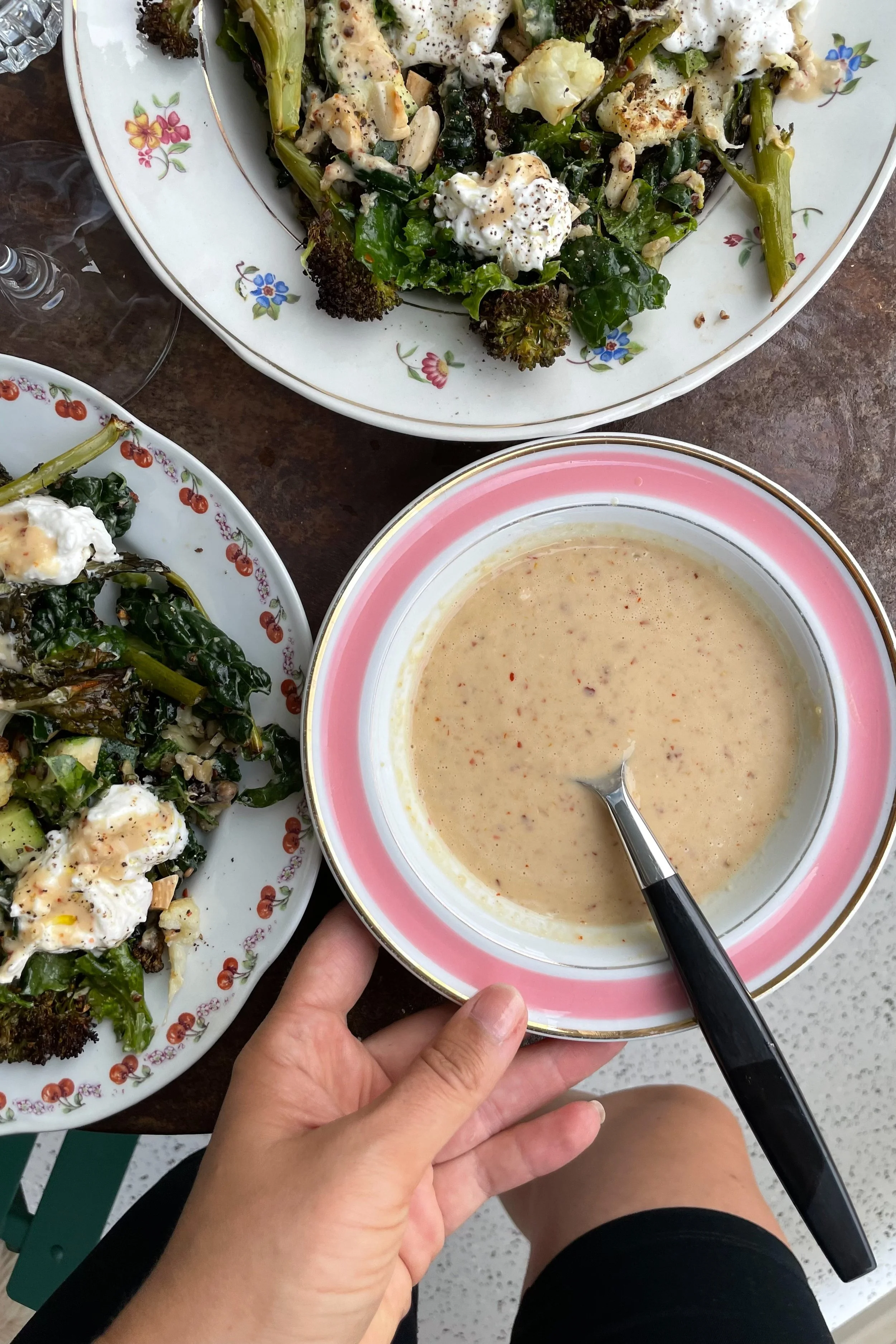 Tässä siis Sweet Greenin kuuluisa, erittäin koukuttava ja äärettömän herkullinen Spicy Cashew -soosi. Tätä purkillinen jääkaappiin ja elämänlaatu paranee heti ainakin pikkusen. Soosi sopii kaikkeen. Me sekoitettiin se salaattiin jossa oli paahdettua kukka- ja parsakaalia, hierottua musta- ja lehtikaalia, keitettyä jyvä-siemensekoitusta ja paahdettuja marcona-manteleita. Päälle fetaa tai bufalaa.
